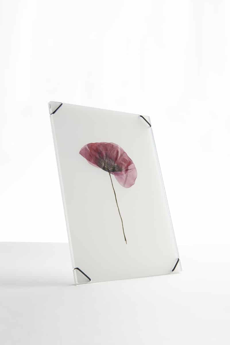 Farbig, subtil und variabel: FlowerFrame ist eine Serie aus rahmenlosen Bildhaltern, die in verschiedenen Tönen eingefärbt sind und nur durch dezente Gummiringe zusammengehalten werden. Sie eignen sich daher ganz besonders zum Rahmen ungewöhnlicher Formate und Objekte.